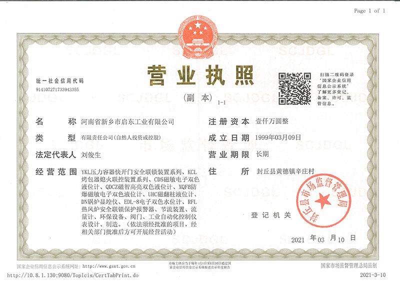 河南省新鄉(xiāng)市啟東工業(yè)有限公司始建于1987年,是專注研發(fā)、生產(chǎn)自動(dòng)化儀器儀表(主要與壓力容器、鍋爐等容器配套使用)的廠家。主要產(chǎn)品有液位計(jì)(磁敏雙色型、磁翻柱型等)系列、烤包器熄火聯(lián)控裝置系列、壓力容器快開門安全聯(lián)鎖保護(hù)裝置系列、鍋爐報(bào)警器系列。二十多年來,公司產(chǎn)品暢銷國內(nèi)并遠(yuǎn)銷俄羅斯、蒙古與東南亞,深得廣大用戶的信賴和好評(píng)。我們多年來致力于自動(dòng)化儀器儀表的研制生產(chǎn),公司現(xiàn)具有完善的生產(chǎn)、試驗(yàn)、檢測手段和設(shè)備。科技創(chuàng)新、誠信服務(wù),是我們不變的經(jīng)營理念,我們將以強(qiáng)有力的技術(shù)支持及售后竭誠為客戶提供良好的服務(wù)。  2012年我公司成功研發(fā)了KCL系列烤包器熄火聯(lián)控裝置,并于2013年2月2日榮獲中華人民共和國國家知識(shí)產(chǎn)權(quán)局辦法的《實(shí)用新型**證書》<**號(hào):2021202257735>該產(chǎn)品廣泛應(yīng)用于唐鋼等大型鋼鐵企業(yè),為烤包器安全作業(yè)提供了有力的保障。  2002年我公司成功研發(fā)磁敏電子雙色液位計(jì)獨(dú)特的高亮度LED紅綠雙色顯示,獲得了專家的首肯和用戶的一致好評(píng)。在此基礎(chǔ)上我公司研發(fā)人員十年磨一劍,致力于XQFB-1防爆型磁敏雙色液位計(jì)的研發(fā),于2013年12月27日由國家防爆電器產(chǎn)品質(zhì)量監(jiān)督檢驗(yàn)中心檢驗(yàn)合格并頒發(fā)防爆合格證書<編號(hào):cnex19.0883>。該產(chǎn)品性能得到了充分的發(fā)揮,廣泛應(yīng)用于含有Ⅱ類A·B級(jí)T1-T4組可燃?xì)怏w或蒸汽與空氣混合形成的爆炸性混合物的0區(qū)、1區(qū)危險(xiǎn)場所。連接用戶DCS或PLC系統(tǒng)實(shí)現(xiàn)遠(yuǎn)距離集中顯示和控制,從而實(shí)現(xiàn)節(jié)能、數(shù)字化管理。為用戶增加了一定的經(jīng)濟(jì)效益和社會(huì)效益,。2014年公司成功申請(qǐng)了夢(mèng)潤儀表的logo,新的品牌新的形象,夢(mèng)潤儀表是啟東的LOGO, 歡迎新老用戶前來洽談合作。  我們一如既往地注重科研的投入,憑借產(chǎn)品的不斷更新、加大科技含量,進(jìn)一步拓展市場。我們相信品質(zhì)成就未來,以過硬質(zhì)量、優(yōu)惠價(jià)格、完善的售后服務(wù)熱忱歡迎廣大客戶來我司視察指導(dǎo)、洽談業(yè)務(wù);精誠合作,共創(chuàng)輝煌!